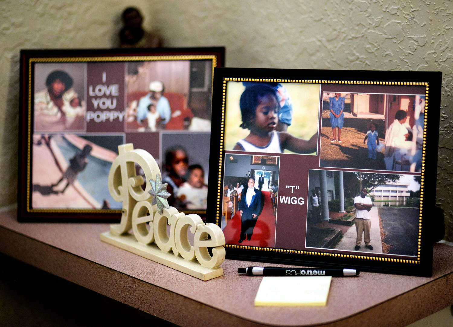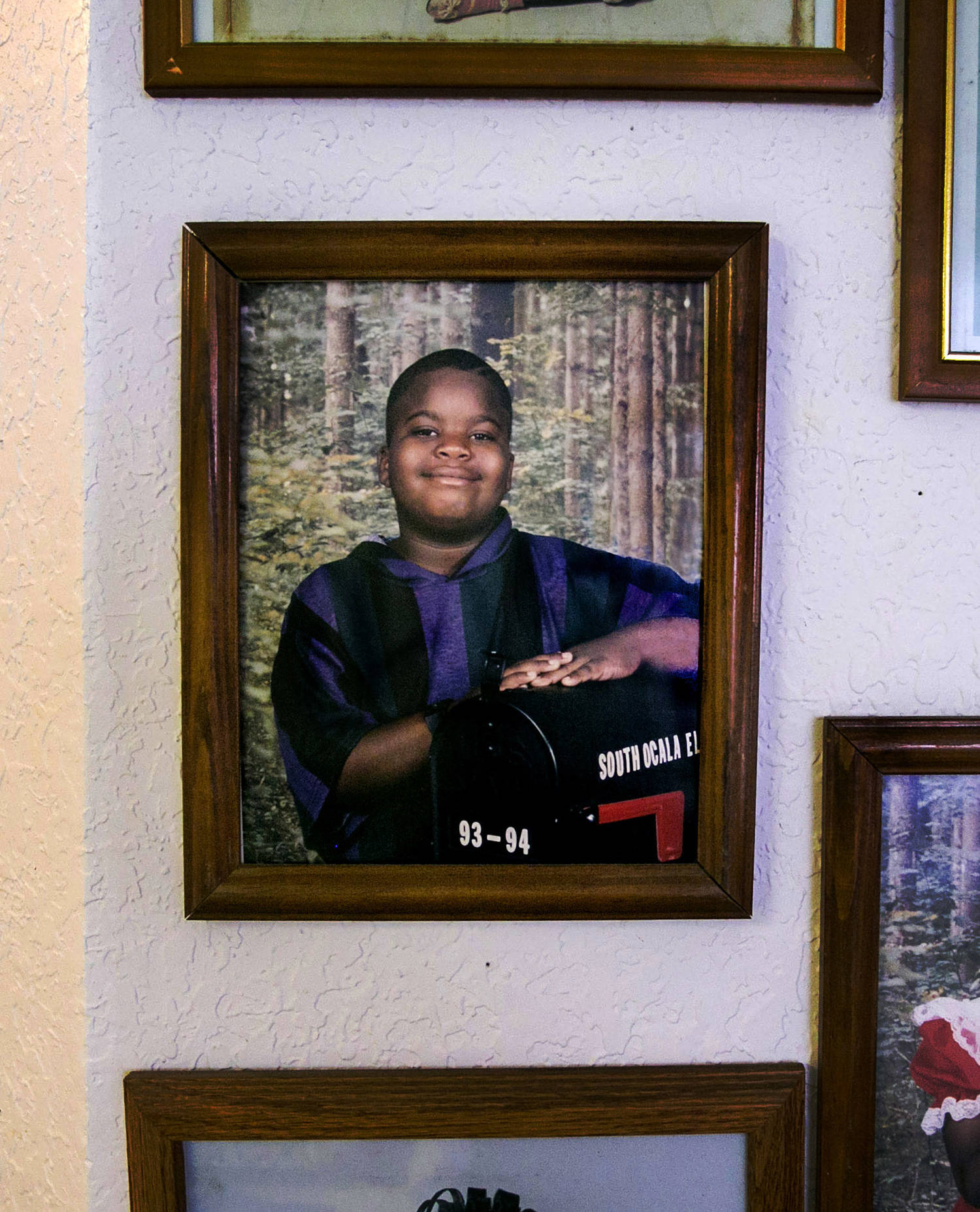 In Margie Mills’ apartment, a bible lay on the table, a portrait of MLK hung on the wall. On the floor by the TV, she had created a shrine to her son: a photo of Richards and the program from his funeral.