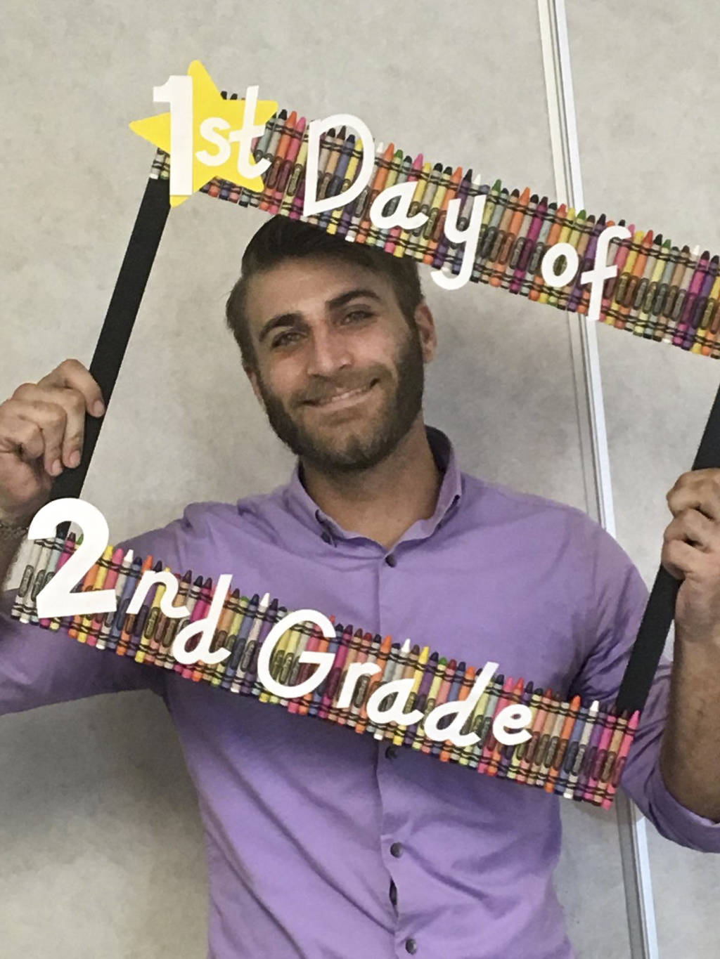 Flushed and nervous, Bruno was hustled into a classroom for an interview. Soon after, he had a job as a second-grade teacher at Fairmount Park. Before the year started, he came to the school with his parents and his fiancee, Lorenza Pardo, a teacher who was heavily pregnant. He posed, smiling, with a sign that said “First Day of Second Grade.”