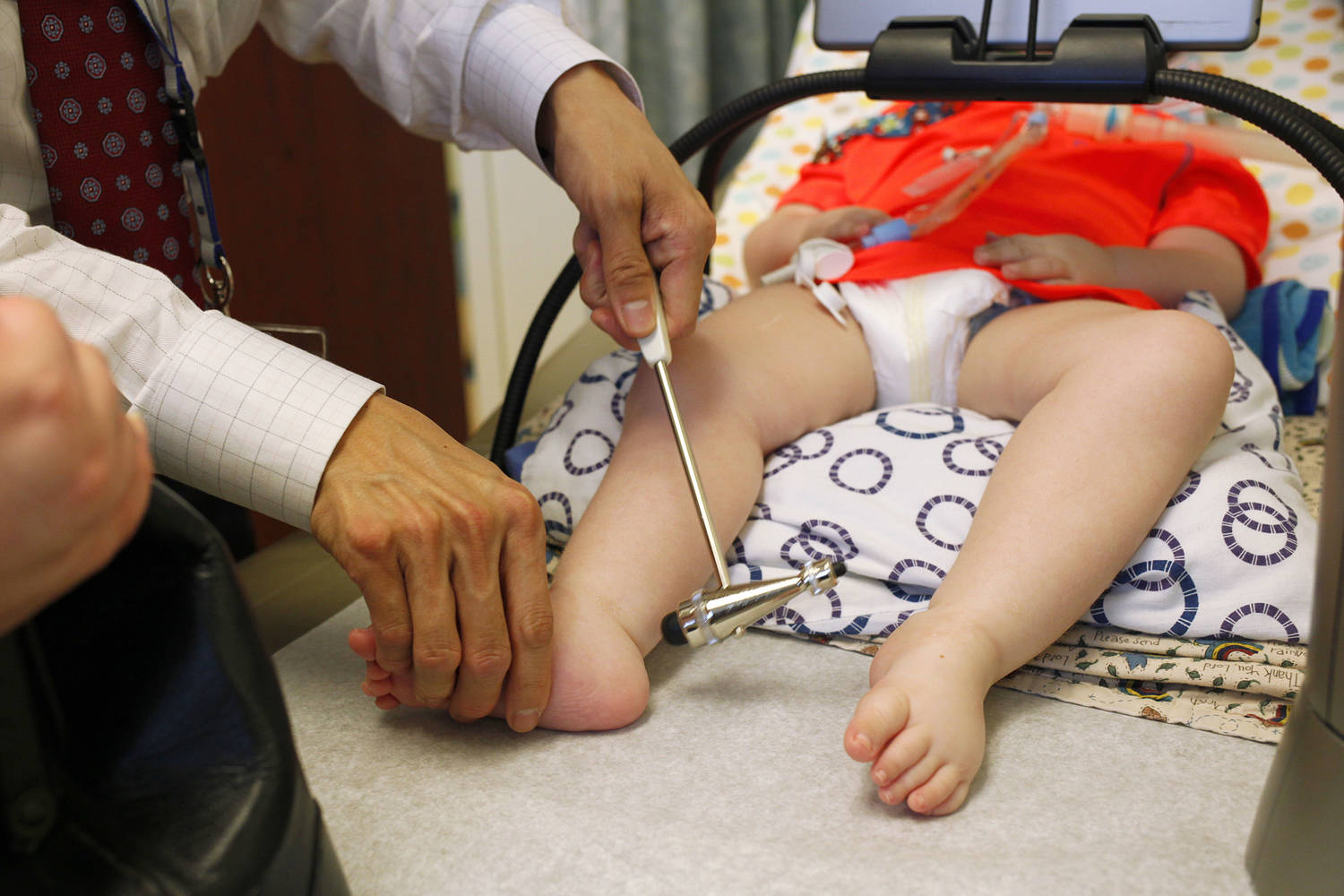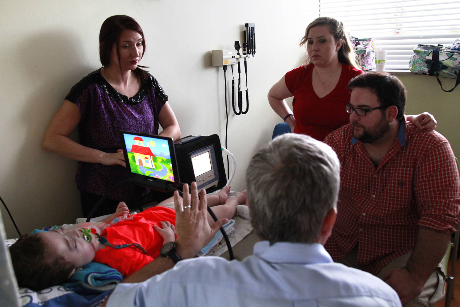 They encouraged him to reach for a rubber duck, kick at a Nerf football, bat objects they strung across his crib on a baby gym.